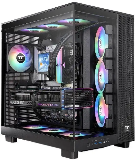 Корпус Thermaltake View 380 XL TG ARGB Black отлично подходит для сборки мощного компьютера. Он выполнен из металла и закаленного стекла, что придает ему стильный и прочный вид. В корпусе есть прозрачная передняя панель с RGB подсветкой, которая создаёт эффектный внешний вид. Он поддерживает материнские платы формата ATX, micro-ATX и mini-ITX и имеет достаточно места для видеокарт длиной до 420 мм. В корпусе расположено 10 слотов для вентиляторов, из которых в комплекте идут четыре, и создается хорошая вентиляция внутри. Можно установить до 4 вентиляторов спереди, сбоку и сверху, а также использовать жидкостное охлаждение до 360 мм снизу, спереди и сбоку. Для хранения данных предусмотрено три отсека 2.5", один внутренний 3.5" отсек и возможность крепления накопителей на съемной корзине. На передней панели есть порты USB 3.2 Gen1 и Gen2, а также USB-C и аудиоразъемы для удобства подключения устройств. Этот корпус отлично подойдет для сборки охлаждаемого и стильного ПК.