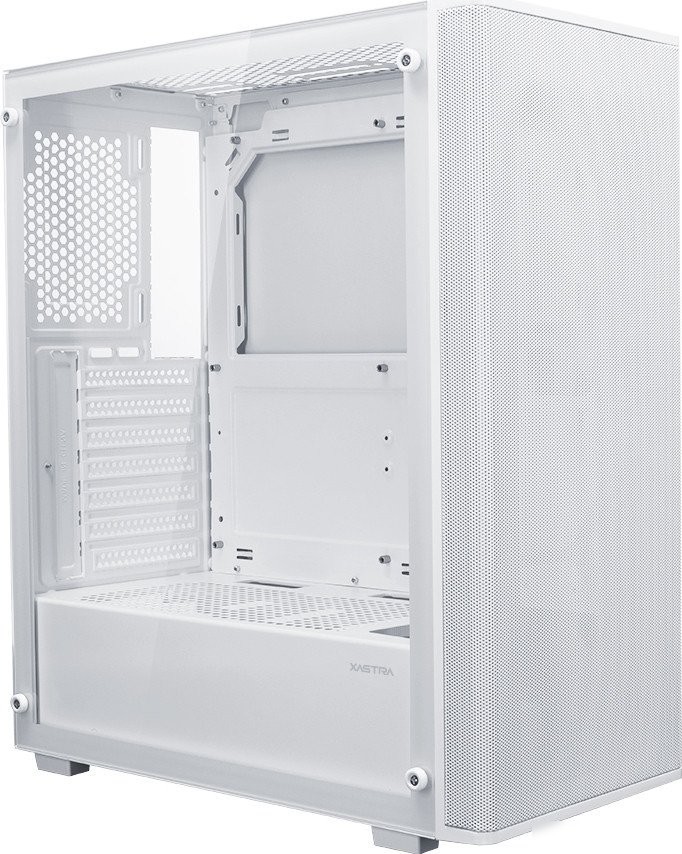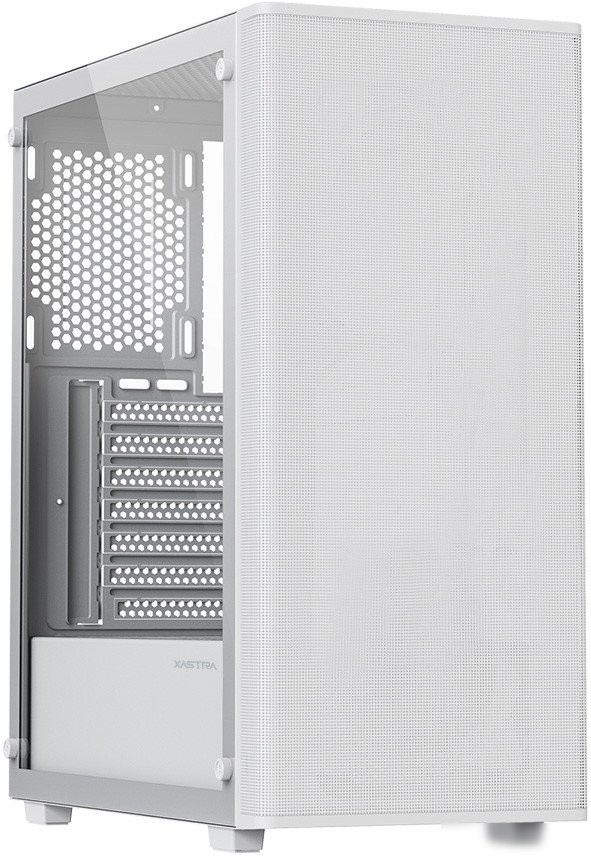 Корпус XASTRA A300 0F сделан из пластика, металла и закаленного стекла, что обеспечивает прочность и стильный вид. Он рассчитан на материнские платы форматов ATX, micro-ATX и mini-ITX, что дает гибкость при сборке компьютера. В корпусе есть простор для видеокарты длиной до 340 мм и процессорного кулера высотой до 158 мм, а также место для блока питания длиной до 170 мм. Он оснащен функциями для хорошего охлаждения: до 8 вентиляторов, возможность установки водяного охлаждения спереди и сверху, а также пылевыми фильтрами, чтобы снизить грязь внутри. Передняя часть корпуса выполнена из сетки и имеет прозрачное окно, позволяющее наблюдать за внутренностями. На передней панели есть два USB 2.0, один USB 3.2 Gen1 и аудиоразъемы для удобства подключения устройств. Также в корпусе есть 2 отсека для жестких или SSD дисков стандарта 2.5/3.5 дюйма. Размеры корпуса позволяют удобно разместить его на рабочем столе или в гардеробной. Основным преимуществом является возможность качественного охлаждения и стильный дизайн с прозрачным стеклом.