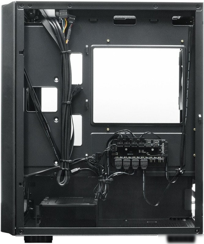 Mini Tower, БП отсутствует, для плат micro-ATX/mini-ITX, с 4 вентиляторами в комплекте, с контроллером вращения, окно: закаленное стекло, видеокарта до 310 мм, охлаждение ЦП до 159 мм, пылевые фильтры, 2xUSB 2.0, 1xUSB-A 3.2 5Гбит/с, цвет черный
