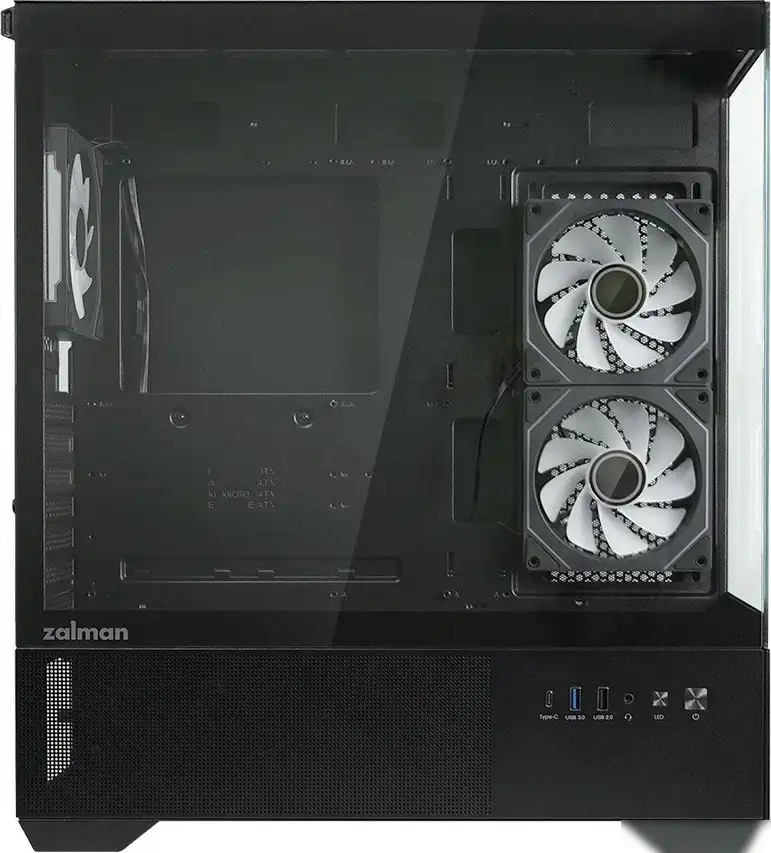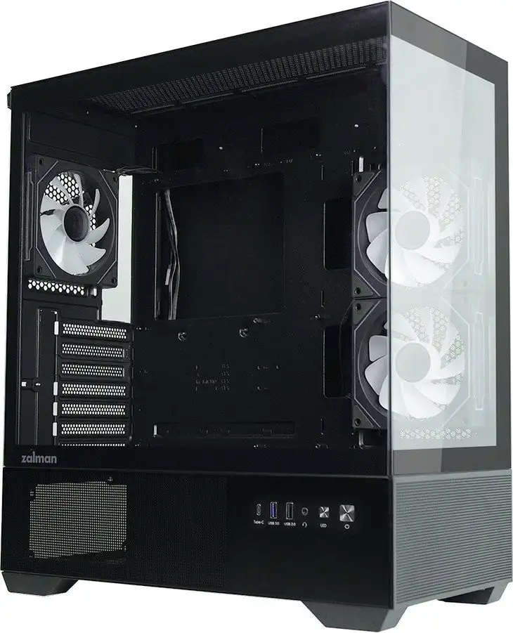 Корпус Zalman Chronix черного цвета подходит для основных форм-факторов Mid Tower и совместим с материнскими платами ATX, micro-ATX и mini-ITX. Он обеспечивает поддержку видеокарт длиной до 410 мм и процессорных кулеров высотой до 165 мм, а также устанавливает до 9 вентиляторов для хорошего охлаждения. В комплект уже входят три вентилятора сARGB-подсветкой, которые помогают создать яркую атмосферу внутри корпуса. Благодаря большим стеклянным окнам из закаленного стекла, вы можете любоваться внутренней начинкой компьютера. В корпусе есть пылевые фильтры снизу, сверху и сзади, что помогает держать внутри чисто. Вы можете установить систему жидкостного охлаждения до 360 мм сверху или 240 мм сбоку, чтобы улучшить теплоотвод. Также есть места для хранения двух SSD и одного HDD, что удобно для хранения данных. На передней панели расположены USB 3.2 Gen1 и Gen2, а также аудиоразъемы для комфортной работы.