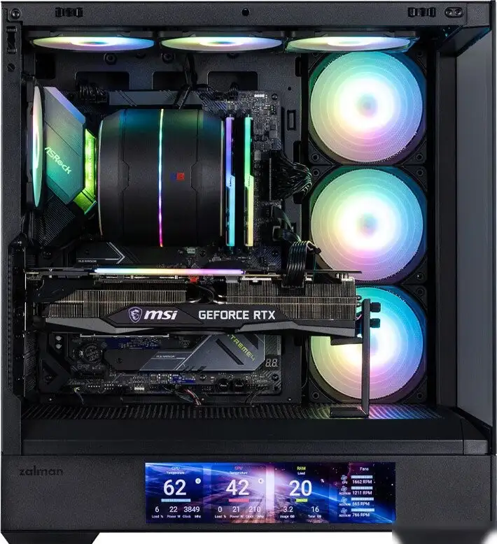 Корпус Zalman P40 DS черного цвета подходит для сборки мощных игровых и рабочих систем. Он поддерживает материнские платы форматов ATX, micro-ATX и mini-ITX. В корпусе реализована хорошая вентиляция: установлено 4 вентилятора и есть место для до 10, что обеспечивает эффективное охлаждение компонентов. Корпус оснащен прозрачным закаленным стеклом и дисплеем с диагональю 9.1 дюйма для отслеживания работы системы. Он позволяет установить видеокарту длиной до 420 мм и кулер высотой до 165 мм. В корпусе есть отсек для SSD 2.5 дюймов и удобная поддержка жидкостного охлаждения до 360 мм. Есть возможность подключать устройства через USB-C и USB 3.2, а также пользоваться фильтрами для защиты от пыли. Корпус прочный и хорошо продуман для хранения и охлаждения важных компонентов. Его размеры и вес делают его стабильным и удобным для переноски.