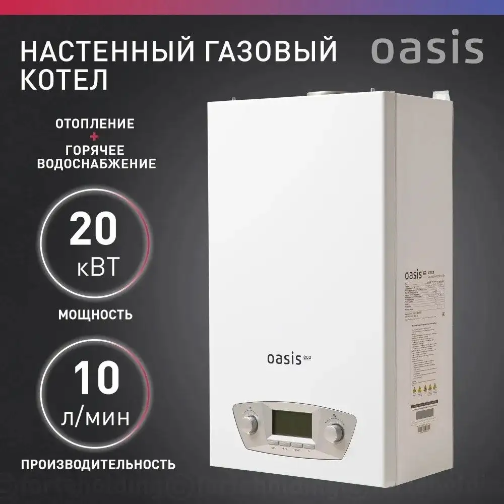 Отопительный котел Oasis Eco RE-20 мощностью 20 кВт подходит для обогрева помещений площадью до 200 м². Он работает на природном газе и предназначен для фиксации на стене, что экономит место. Технология двухконтурного отопления обеспечивает нагрев воды и обогрев дома одновременно. Встроенный бойлер позволяет получать горячую воду с производительностью 10 л/мин при температуре 65°C. Котел оснащён дисплеем для удобства управления и комнатным регулятором температуры, что помогает поддерживать комфортное тепло. Модель включает вытяжной вентилятор и со встроенным расширительным баком объемом 6 л.
