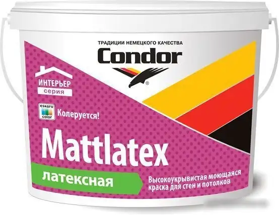 Краска Condor ВД Mattlatex 15 кг предназначена для внутренних работ, таких как окраска стен и потолков. Она обладает глубокоматовым покрытием, которое хорошо скрывает неровности поверхности. В основе лежит латексная формула, которая разводится водой и легко наносится валиком, кистью или распылителем. Вес ведра составляет 15 кг, а расход — примерно 0,1-0,125 л на квадратный метр. Время высыхания составляет около 6 часов. Эта краска хорошо подходит для тех, кто хочет быстро и удобно покрасить комнату. Среди её особенностей – возможность колеровки, что позволяет выбрать нужный оттенок практически любого цвета.