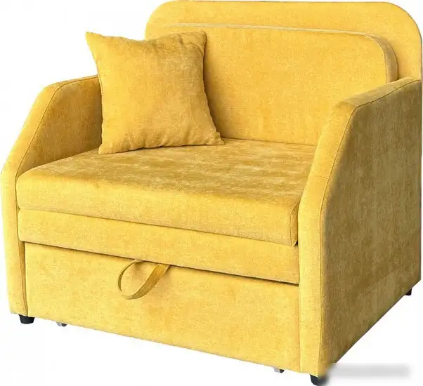 Кресло-кровать Анмикс Кейт 800 выполнено из мягкой ткани ярко-жёлтого цвета, что добавит уюта в ваш дом. Оно легко превращается в спальное место благодаря выкатному механизму, что удобно для гостей или ежедневного использования. Конструкция включает ящик для белья, где можно хранить постельные принадлежности и подушки. Размеры кресла позволяют разместить его даже в небольших комнатах — ширина 90 см, глубина 75 см, высота 86 см. Спальное место длиной 186 см и шириной 80 см подходит для комфортного сна. Простая трансформация занимает минимум времени и усилий. Каркас кресла обеспечивает стабильность и длительный срок службы. Эти функции делают кресло практичным и универсальным решением для любой квартиры или комнаты.