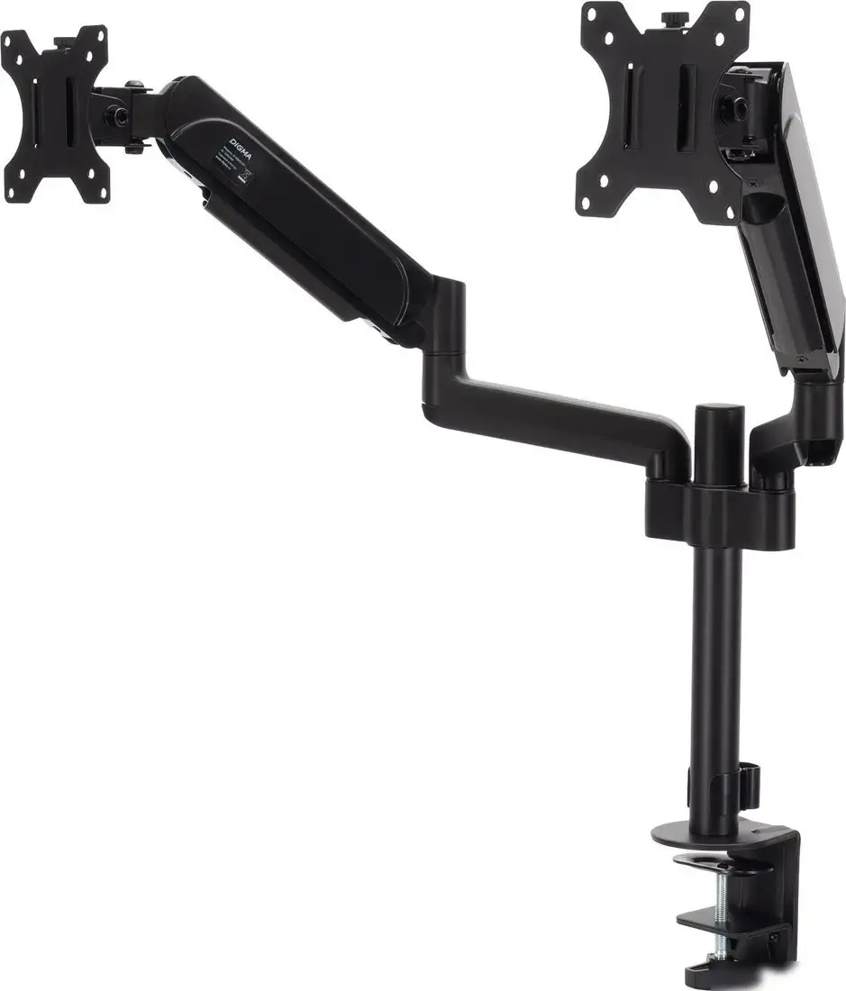 Кронштейн Digma D-MM202D черного цвета предназначен для крепления двух мониторов с диагональю от 17 до 32 дюймов. Он подходит для установки на стол или столешницу и совместим с креплениями VESA размером 75x75 или 100x100 мм. Этот кронштейн позволяет регулировать угол наклона до 35° и поворачивать мониторы на 90°, что помогает удобно настроить рабочее место. Максимальная нагрузка на каждый монитор — 9 кг, что подходит для большинства моделей. В конструкции есть кабель-канал для аккуратной организации проводов и струбцинное крепление для надежной фиксации. Благодаря этим функциям, вы можете легко менять положение мониторов и держать рабочее пространство аккуратным. Кронштейн прост в использовании и обеспечивает стабильность и комфорт при работе.
