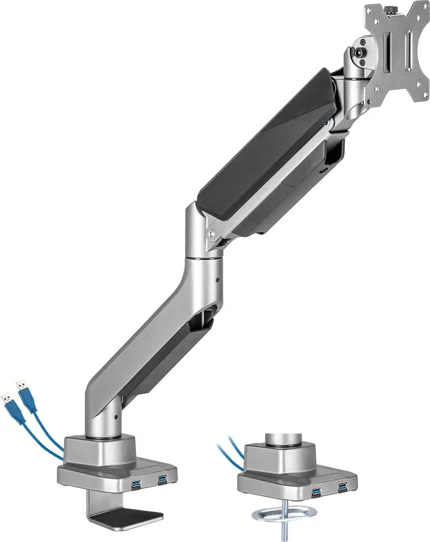 для мониторов, 17-49", 1 монитор, настольный, поворотный, с регулировкой высоты, кабель-канал, струбцинное крепление, USB-хаб, наклон 90°, поворот 180°, цвет серебристый