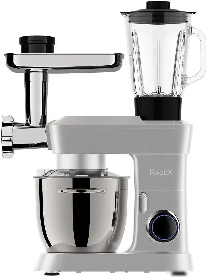 Кухонная машина RageX R112-900 сделана в Китае и пригодна для множества задач на кухне. У неё мощность 1300 Вт, что позволяет быстро и качественно смешивать, взбивать и замешивать тесто, а также перерабатывать продукты с помощью мясорубки и овощерезки. Чаша объёмом 4.5 литра из металла подходит для приготовления больших порций. В приставку входит 10 скоростей, что делает работу более точной и удобной. В комплекте есть множество насадок, например, для теста, взбивания, нарезки и шинковки, что расширяет возможности кухни. Благодаря планетарному смешиванию продукты равномерно перемешиваются, а защитная крышка помогает поддерживать чистоту.