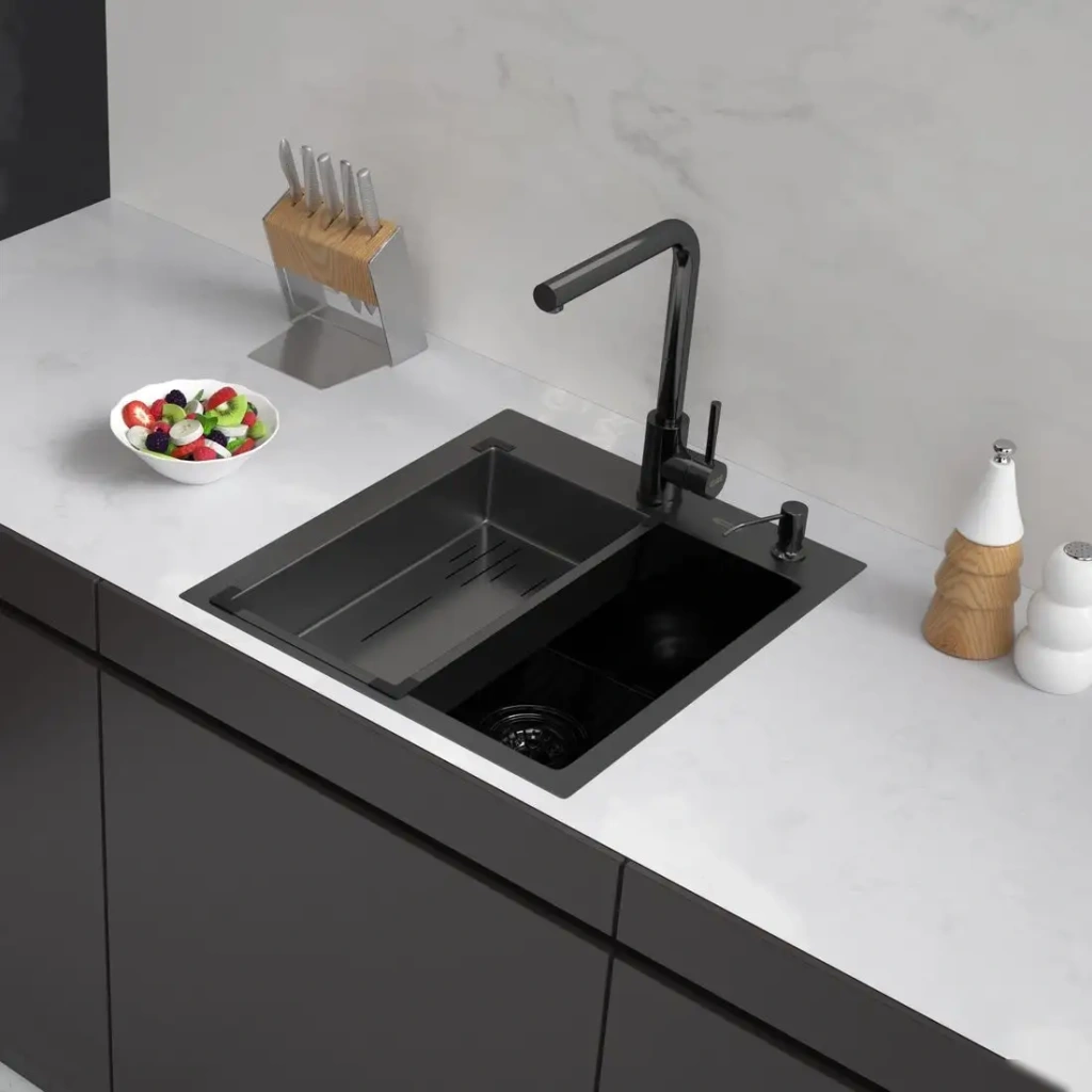 Кухонная мойка ARFEKA Eco AR имеет прямоугольную форму и изготовлена из нержавеющей стали толщиной 2,5 мм, что обеспечивает долговечность и устойчивость к коррозии. Мойка устанавливается врезным способом на столешницу и подходит для шкафов шириной 50 см. Она оснащена одной глубокой чашей (20 см), которая удобно позволяет мыть крупные предметы, а расположение по центру облегчает использование. В комплектацию входит коландер для просеивания и нарезки продуктов, а также дозатор для жидкого мыла, что делает работу на кухне более практичной. На мойке есть перелив и сливная арматура диаметром 3,5 дюймов, обеспечивающие надежное сливание воды. Ее поверхность выполнена в матовом черном цвете, что подчеркивает стиль интерьера. Благодаря простоте конструкции и отсутствию дополнительных отделок, эта мойка легко моется и очищается. Этот комплект включает саму мойку, коландер, дозатор и сливную арматуру, все необходимые для установки. Размеры мойки: длина — 50 см, ширина — 45 см, а диаметр сливного отверстия — 3,5 дюймов, что совместимо с большинством стандартных систем.