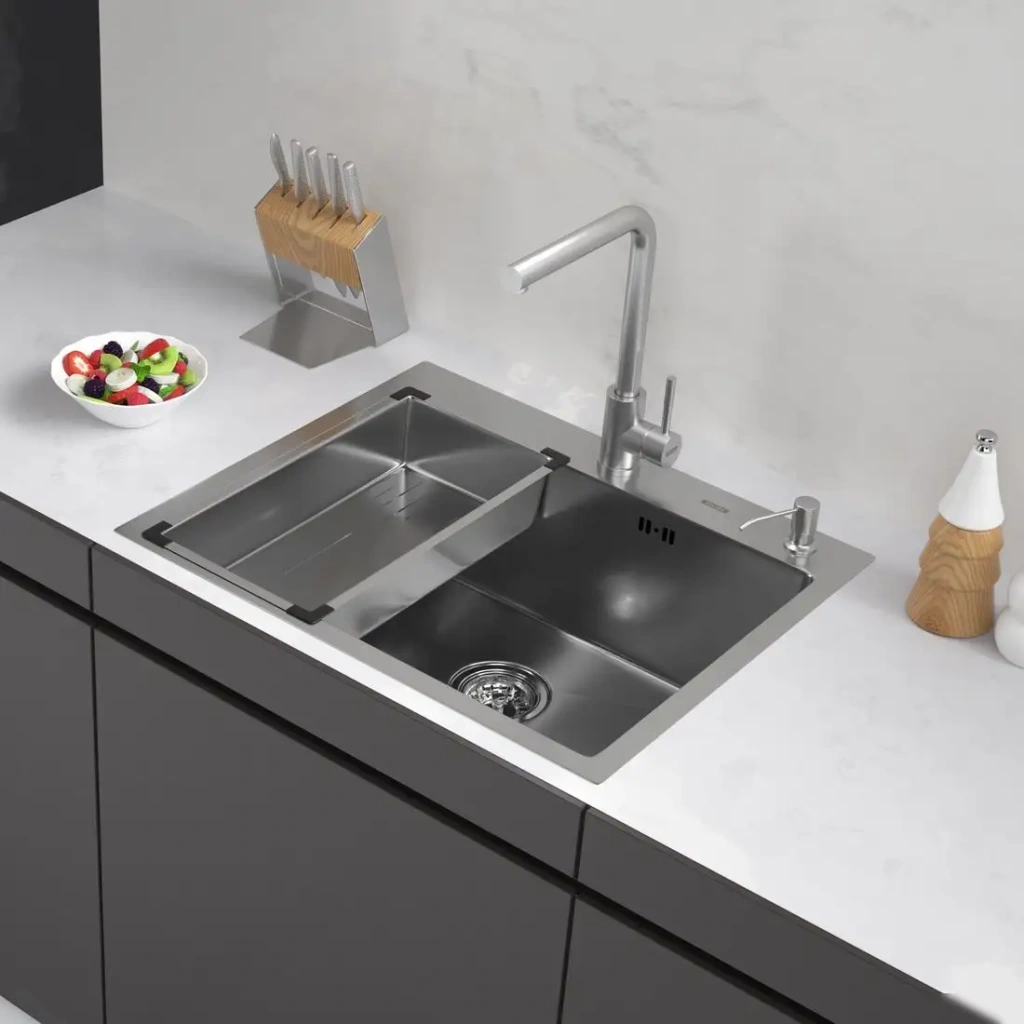 Кухонная мойка ARFEKA Eco AR имеет размеры 600x500 мм и выполнена из прочной нержавеющей стали толщиной 2,5 мм с текстурированной поверхностью. Она устанавливается врезным способом и располагается по центру столешницы, что обеспечивает удобство в использовании. Мойка оснащена одной большой чашей глубиной 20 см, что позволяет легко мыть крупные предметы и продукты. В комплект входит коландер для отбора воды и чистки продуктов, а также дозатор для жидкого мыла, что делает уборку и мытье проще. Сливная арматура есть, диаметр отверстия 3,5 дюйма, что обеспечивает быстрый слив воды. Мойка не требует дополнительных отделочных элементов и не поставляется со смесителем или разделочной доской. Ее стильный сатиновый цвет отлично впишется в современную кухню и устойчив к загрязнениям. Благодаря качественной конструкции и простым функциям эта мойка станет надежным помощником на кухне.