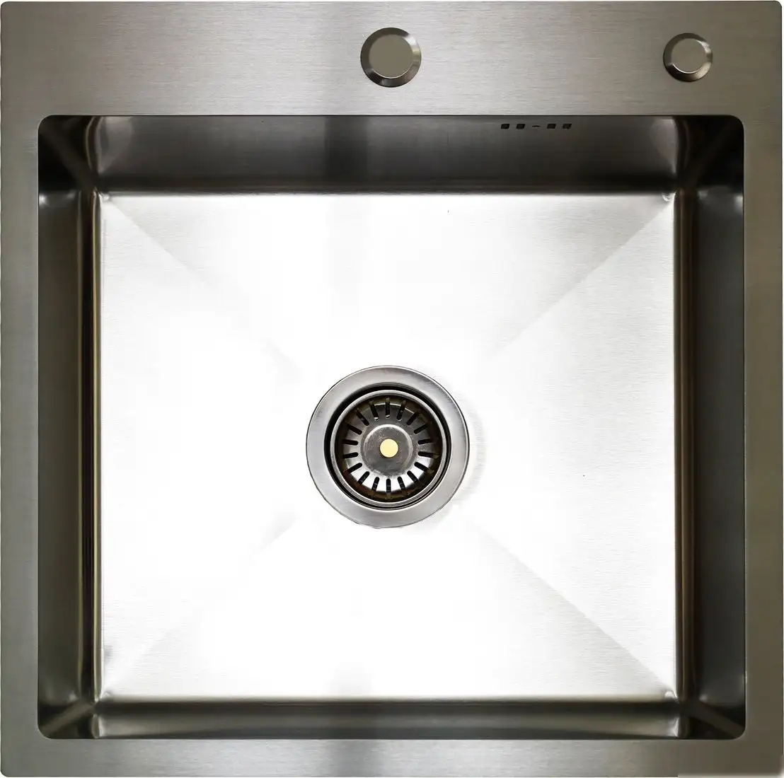Кухонная мойка Blantek FS-5050S Brushed ECO – это врезная модель с одной чашей, сделанная из прочной нержавеющей стали толщиной 1 мм. Она имеет современную сатиновую поверхность и черный цвет, что отлично впишется в любой кухонный дизайн. Глубина чаши 20 см позволяет легко мыть посуду и продукты. Мойка устанавливается в шкаф шириной 60 см и занимает площадь 50 на 50 см. В комплект входят сливной клапан, перелив и крепеж, что упрощает монтаж и использование. В центре чаши расположено отверстие для слива, а внешний вид дополнен PVD-покрытием для устойчивости к повреждениям и пятнам.