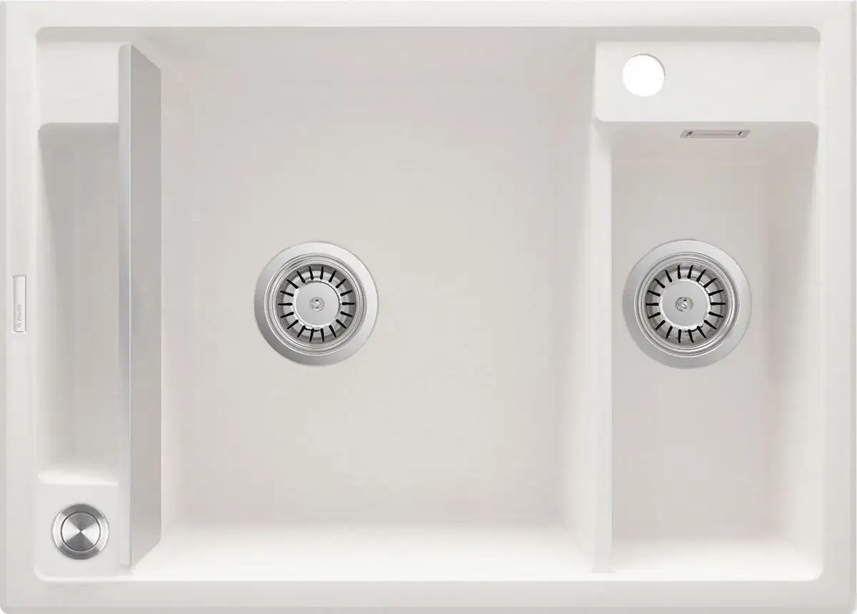 Кухонная мойка Deante Magnetic ZRM A503 выполнена из искусственного камня на основе гранитной крошки и имеет стильный белый цвет. Она устанавливается врезным способом на столешницу, что обеспечивает плотное и аккуратное закрепление. Мойка обладает одной основной чашей, которая разделена на 1,5 части для удобства разделения посуды и продуктов. Глубина чаши составляет 21,9 см, что удобно для мытья крупных предметов. Размеры мойки — 69 см в длину и 50 см в ширину — подходят для шкафов шириной 70 см.Конструкция с расположением основной чаши слева обеспечивает комфорт при использовании. Мойка легко вписывается в современный интерьер, сочетая практичность и стиль. Благодаря качественным материалам, она долговечна и устойчива к царапинам. Это надежное решение для современной кухни, которое облегчает повседневную работу.