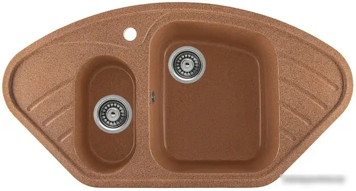 Кухонная мойка Gerhans E02 (терракотового цвета) предназначена для врезания в столешницу, что делает её монтаж простым и удобным. Она имеет угловую форму с одной большой и одной меньшей чашей, глубина которых составляет 18 и 14.5 см соответственно. Основной материал – искусственный камень, что обеспечивает прочность и долговечность. Мойка обладает крылом для дополнительного удобства, а также сливным отверстием диаметром 3.5 дюймов. Размеры – 95 см в ширину и 50.5 см в глубину – подходят для стандартных кухонных пространств. У этой модели есть перелив в основной чаше, что помогает избежать переполнения. В комплекте нет смесителя, клапана или разделочной доски, что стоит учитывать при покупке.