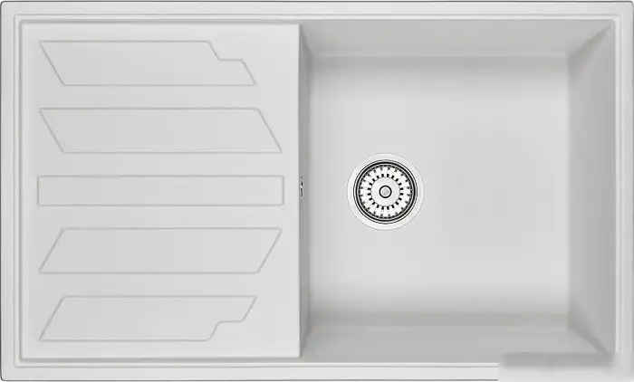 Кухонная мойка Granula GR-8601 (арктик) имеет прямоугольную форму и устанавливается врезной способом на столешницу. Она изготовлена из качественного искусственного камня на основе кварцевого песка, что делает её прочной и долговечной. Мойка оборудована одной чашей глубиной 20 см, которая удобно подходит для мытья посуды и продуктов. Ширина мойки составляет 86 см, а глубина — 50 см, что идеально подходит для кухонных шкафов шириной 60 см. В комплект входит сифон, что облегчает монтаж и эксплуатацию. Особенностью модели является крыло, которое позволяет размещать кухонные принадлежности и аксессуары.