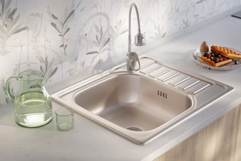 Кухонная мойка КромРус EC-296-D выполнена из нержавеющей стали с матовой поверхностью, что делает её прочной и стойкой к коррозии. Она устанавливается прямо на столешницу и имеет прямоугольную форму с одной чашей глубиной 16 см, идеально подходящей для повседневных задач. Мойка легко меняет расположение основной чаши благодаря оборачиваемой конструкции, что удобно в использовании. В комплекте идут крепления и уплотнительная лента для быстрого и надежного монтажа. Внутри есть перелив, предотвращающий переливание воды, и крыло для удобства при подготовке продуктов. Размеры позволяют установить её в шкаф шириной 40 см, а длина всей мойки — 50 см, ширина — 58 см. Диаметр сливного отверстия составляет 3.5 дюйма, что обеспечивает быстрый слив воды. Толщина стали 0.6 мм гарантирует долговечность, а матовая поверхность скрывает мелкие царапины и отполирует внешний вид.