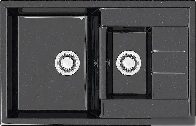 Кухонная мойка MARRBAXX 210/Q4 F210Q004 выполнена из искусственного камня на основе мраморной крошки, что обеспечивает прочность и привлекательный вид. Она устанавливается врезным способом на столешницу и подходит для шкафов шириной 80 см. Основная чаша имеет глубину 21.8 см, а меньшая — 16 см, что удобно для различных кухонных задач. Матовая поверхность легко моется и скрывает небольшие царапины. Мойка имеет оборачиваемую расположение основной чаши и встроенный перелив для предотвращения затопления. В комплект не входит смеситель, что позволяет выбрать устройство по своему вкусу. Размеры мойки — 75.5 см в длину и 50 см в ширину, диаметр сливного отверстия — 3.5 дюйма. Внутренние размеры чаш — 33.7 см на 43.7 см, а дополнительные чаши имеют размеры 17.2х28 см, расширяя функциональность.