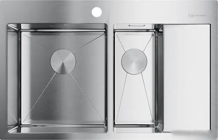 Кухонная мойка Omoikiri Akisame 78-2 IN-L отличается компактным размером и простотой установки в вырез на столешнице. Она имеет одну основную и одну меньшую чашу, обе глубиной 20 см, что позволяет удобно мыть посуду и продукты. Мойка изготовлена из нержавеющей стали толщиной 1.2 мм, что обеспечивает долговечность и устойчивость к коррозии. Поверхность матовая с PVD покрытием, легко очищается и сохраняет внешний вид. Мойка подходит для шкафов шириной 60 см и устанавливается вровень со столешницей для эстетичного вида. В комплект входят крепления, донный клапан и отводная арматура, что упрощает монтаж. Размеры ниши для встраивания составляют 76x49 см. Важной особенностью является наличие переливов в каждой чаше, предотвращающих перелив воды.