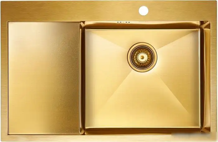 Мойка Paulmark Atlan PM217851-BGR выполнена из нержавеющей стали с красивым брашированным золотым цветом. Она устанавливается врезным способом на столешницу и имеет прямоугольную форму. Глубина чаши составляет 20 см, что удобно для мытья посуды и продуктов. Основная чаши расположена слева, а есть дополнительное крыло для удобства работы. Размеры мойки: 78 см в длину и 51 см в ширину. Эта модель очень прочная и проста в уходе. Также в комплекте нет разделочной доски и корзины, что делает её более доступной и удобной в использовании.