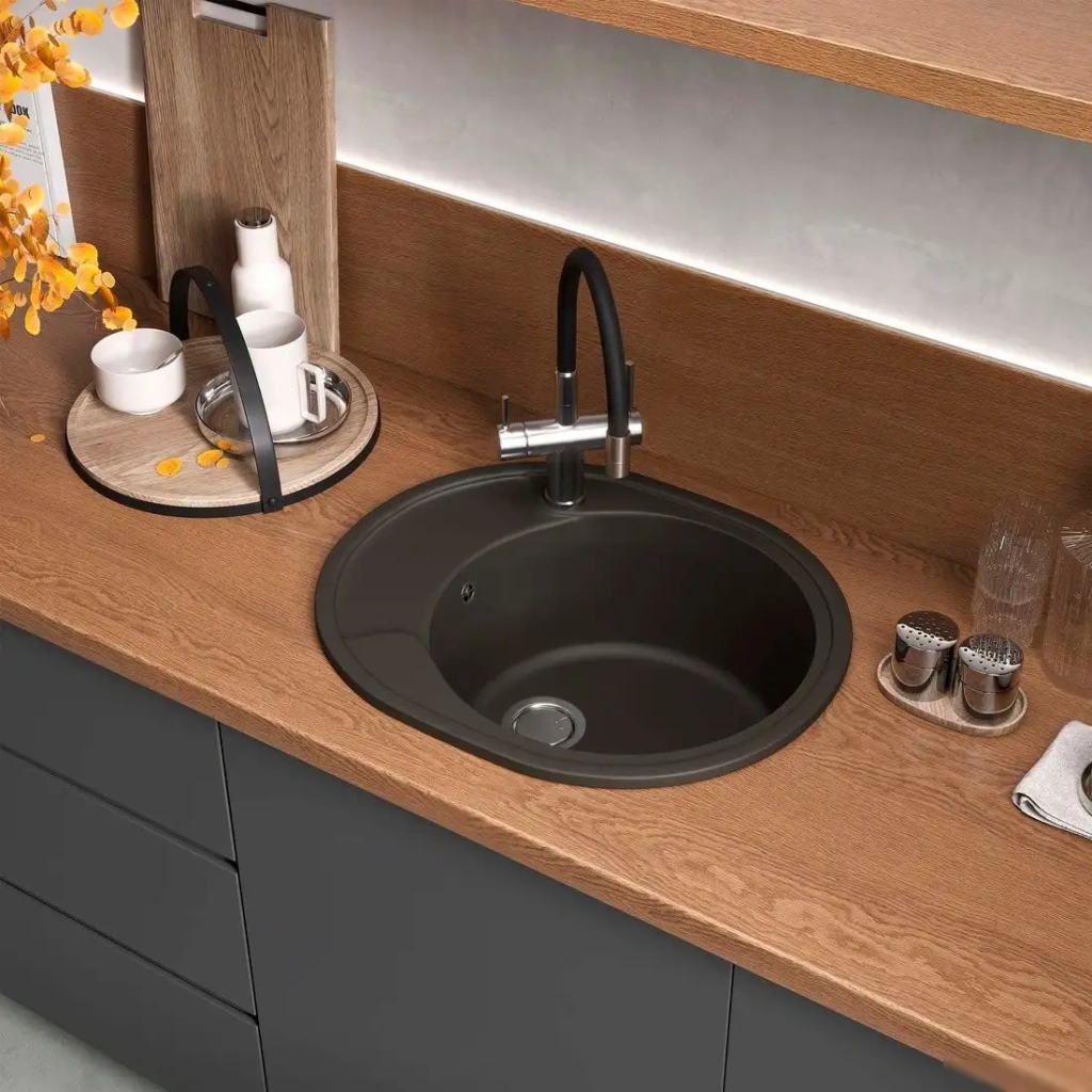 Кухонная мойка Reflexion Allonge RF0658BL выполнена из искусственного камня на основе кварцевого песка, что делает её прочной и долговечной. Мойка устанавливается врезным способом на столешницу и подходит для шкафов шириной 50 см. У неё одна глубокая чаша глубиной 18 см, что удобно для мытья посуды и продуктов. Чаша оборачивается, что облегчает монтаж и использование с любой стороны. В устройстве есть перелив для предотвращения затопления и боковое крыло для удобства размещения моющих средств или дополнительных аксессуаров. Цвет мойки — классический черный, она хорошо сочетается с разными стилями кухни. Не входит в комплект смеситель или диспенсер, но поставляется вместе с гарантийным талоном и упаковкой. Габариты мойки: длина 48 см и ширина 57 см, диаметр сливного отверстия — 3,5 дюйма. Эта модель отлично подходит для тех, кто ценит практичность и современный дизайн.