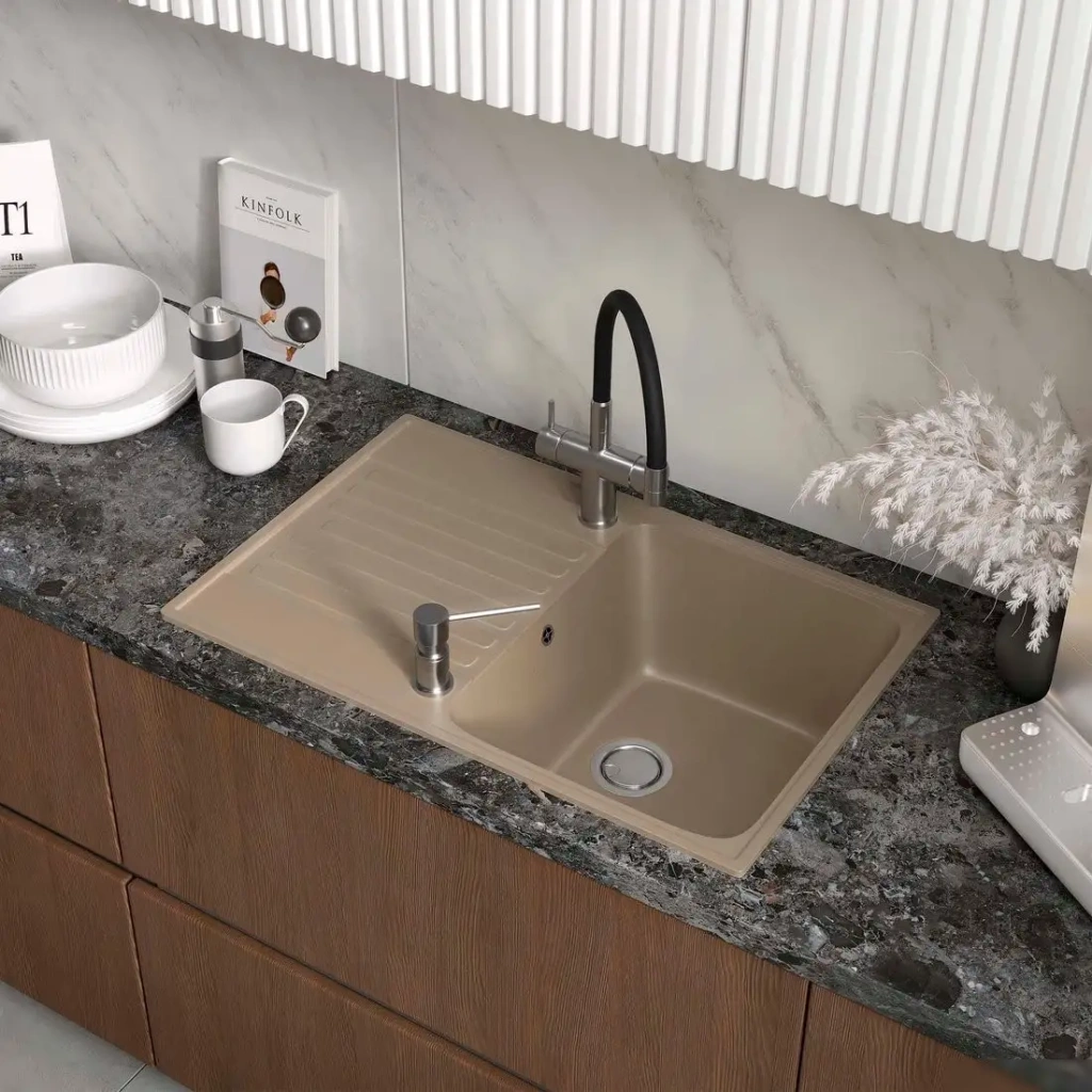Кухонная мойка Reflexion Bolero RF0574BE имеет прямоугольную форму и легко устанавливается врезным способом на столешницу. Она выполнена из искусственного камня на основе кварцевого песка, что обеспечивает прочность и долговечность. Мойка оснащена одной оборачиваемой чашей глубиной 18 см, что удобно для мытья посуды и продуктов. Ее размеры позволяют установить в шкаф шириной 50 см, а ширина самой мойки — 73,6 см. В комплектацию входит только сама мойка и гарантийный талон, упаковка с жесткими ребрами защищает при транспортировке. Основная чаша оборудована переливом, предотвращающим переполнение, а на боковой стороне есть крыло для размещения моющих средств или губок. Мойка не включает смеситель и другие дополнительные элементы, она предназначена для тех, кто ценит простоту и практичность. Благодаря яркому бежевому цвету она легко сочетается с разными интерьерными решениями кухни.