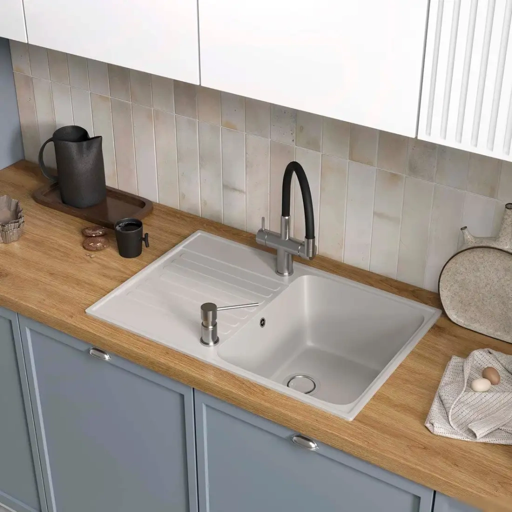 Кухонная мойка Reflexion Bolero RF0574GR выполнена из искусственного камня на основе кварцевого песка, что обеспечивает её прочность и приятный внешний вид. Она устанавливается врезным способом на столешницу и подходит для шкафов шириной 50 см. Мойка имеет одну глубокую чашу глубиной 18 см и размеры 41,9 × 34,9 см, что удобно для мытья посуды и продуктов. Основная чаша расположена оборачиваемо, что облегчает монтаж и использование. В конструкции есть перелив, который предотвращает переполнение воды. В комплекте отсутствует смеситель и дополнительные аксессуары, но в упаковке вы найдете гарантийный талон и упаковку с ребрами жесткости. Мойка обладает простым современным дизайном серого цвета, легко сочетается с любой кухней. Диаметр сливного отверстия — 3,5 дюйма, что обеспечивает быстрый слив воды. Эта модель идеально подходит для тех, кто ищет практичную и надежную кухонную мойку с хорошими техническими характеристиками.