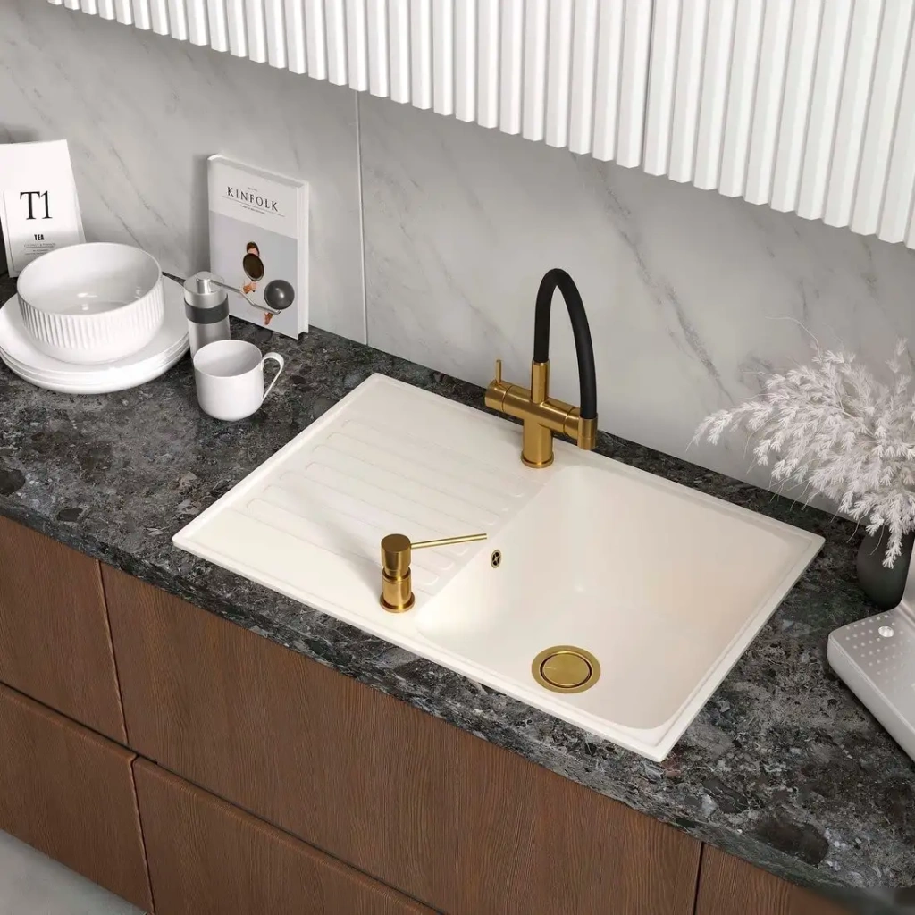 Кухонная мойка Reflexion Bolero RF0574WH имеет прямоугольную форму и изготовлена из искусственного камня на основе кварцевого песка, что обеспечивает прочность и долговечность. Основная чаша глубиной 18 см удобно подойдет для мытья посуды и продуктов. Мойка устанавливается врезной способ на столешницу шириной 50 см, что делает её легкой в монтаже. Оборачиваемая расположение чаши позволяет выбрать наиболее удобный для вас вариант установки. В конструкции есть перелив, что помогает избежать переливания воды. Культура использования поддерживается за счет отсутствия шумопоглощающего покрытия и комплектации, включающей лишь саму мойку, гарантийный талон и упаковку. Размеры мойки — 47.6 см по длине и 73.6 см по ширине, диаметр сливного отверстия — 3.5 дюйма. Это простая и надежная мойка без лишних функций, которая хорошо впишется в современную кухню.
