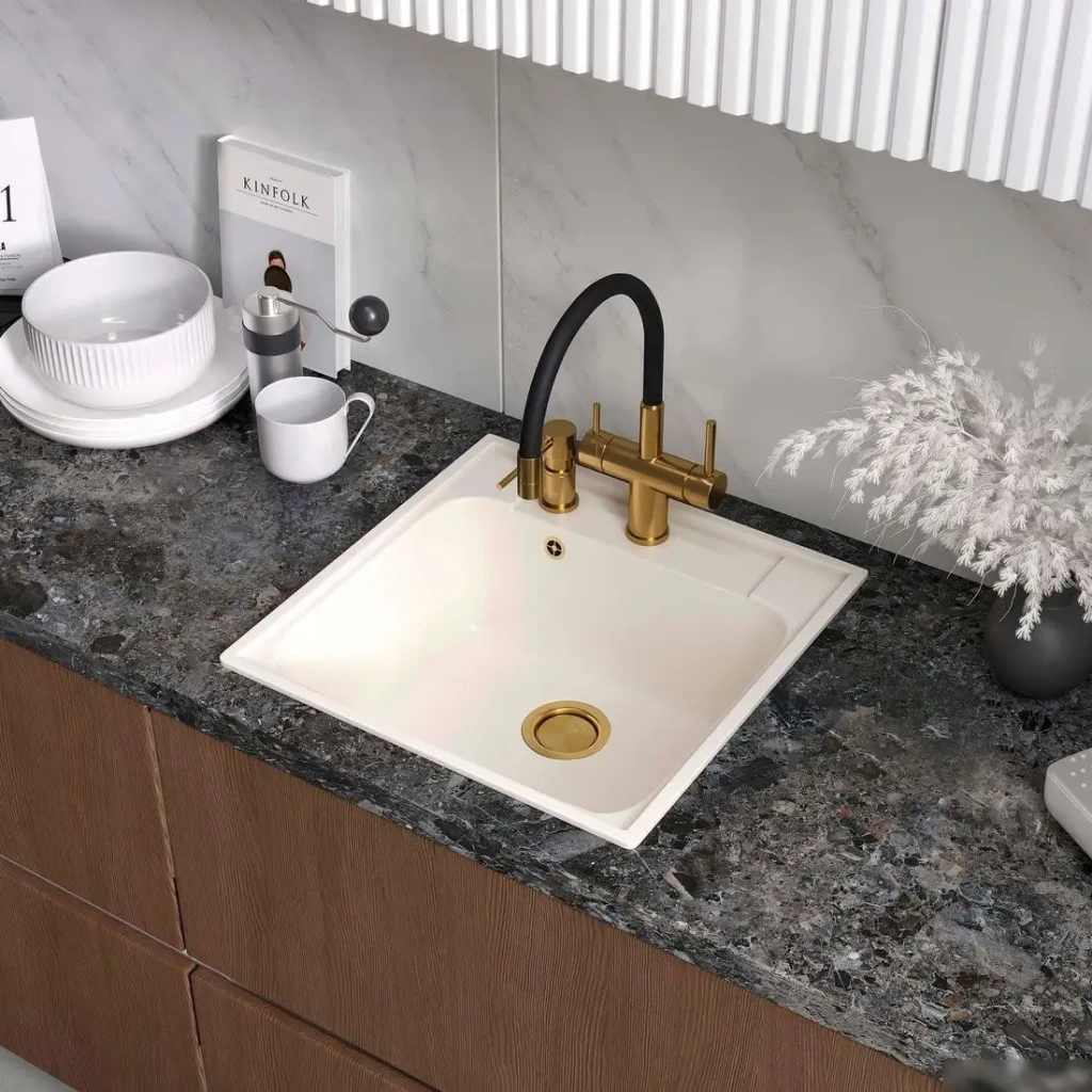 - Центральное расположение чаши — облегчает доступ и работу в кухонной зоне.