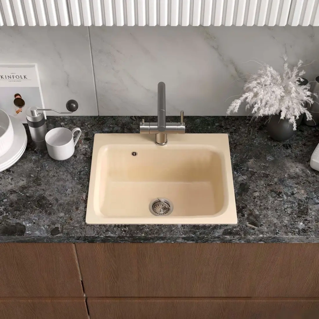 Кухонная мойка Reflexion Optima RX0952BE выполнена из искусственного камня на основе кварцевого песка, что обеспечивает прочность и стильный внешний вид. Ее прямоугольная форма и глубокая чаша глубиной 16 см подходят для удобной обработки посуды и продуктов. Мойка устанавливается врезной способ, что позволяет seamlessly встроить ее в столешницу шириной 60 см. Основная чаша расположена по центру, а в ней есть перелив для предотвращения переполнения. Размеры мойки — 43 см в длину и 52 см в ширину, диаметр сливного отверстия — 3,5 дюйма. Поскольку в комплекте нет смесителя и аксессуаров, их можно подобрать отдельно. Благодаря гладкому бежевому цвету мойка легко сочетается с разными интерьерами кухни. Модель поставляется с гарантией и надежной упаковкой для защиты при транспортировке.