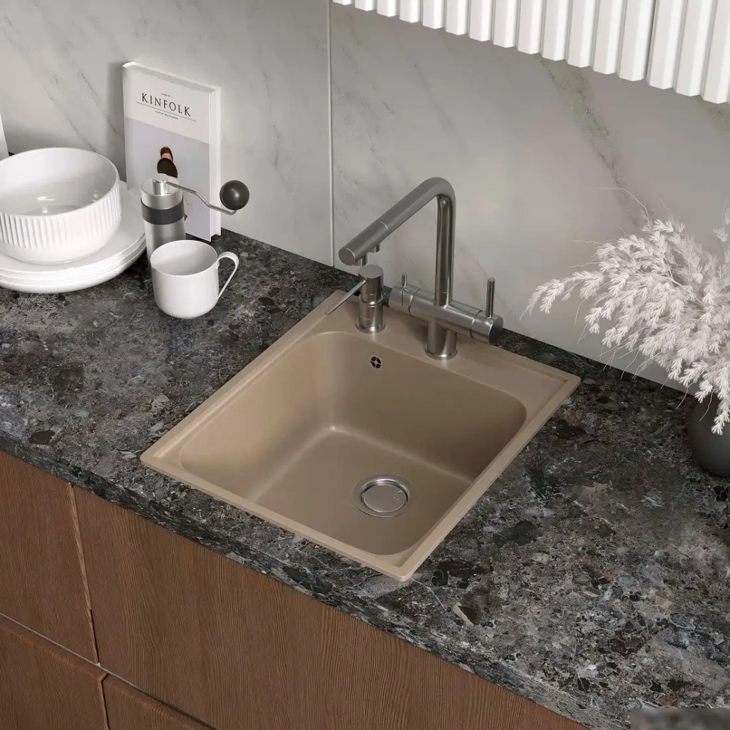 Кухонная мойка Reflexion Quadra RF0243BE предназначена для врезания в столешницу и подходит для шкафов шириной 45 см. Она имеет одну прямоугольную чашу, выполненную из искусственного камня на основе кварцевого песка, что обеспечивает долгий срок службы и устойчивость к царапинам. Глубина чаши составляет 18 см, что удобно для мытья больших посуды и продуктов. Мойка расположена по центру и оснащена переливом, который предотвращает перелив воды. Ее размеры — длина 47,7 см и ширина 41,8 см — подходят для стандартных кухонных габаритов. В комплект не входит смеситель, клапан-автомат или разделочные доски, что дает возможность выбрать оборудование по своему вкусу. Благодаря простому дизайну и классическому бежевому цвету она подойдет практически под любую кухню. Эта мойка легко моется и устойчива к повреждениям благодаря материалу из искусственного камня.