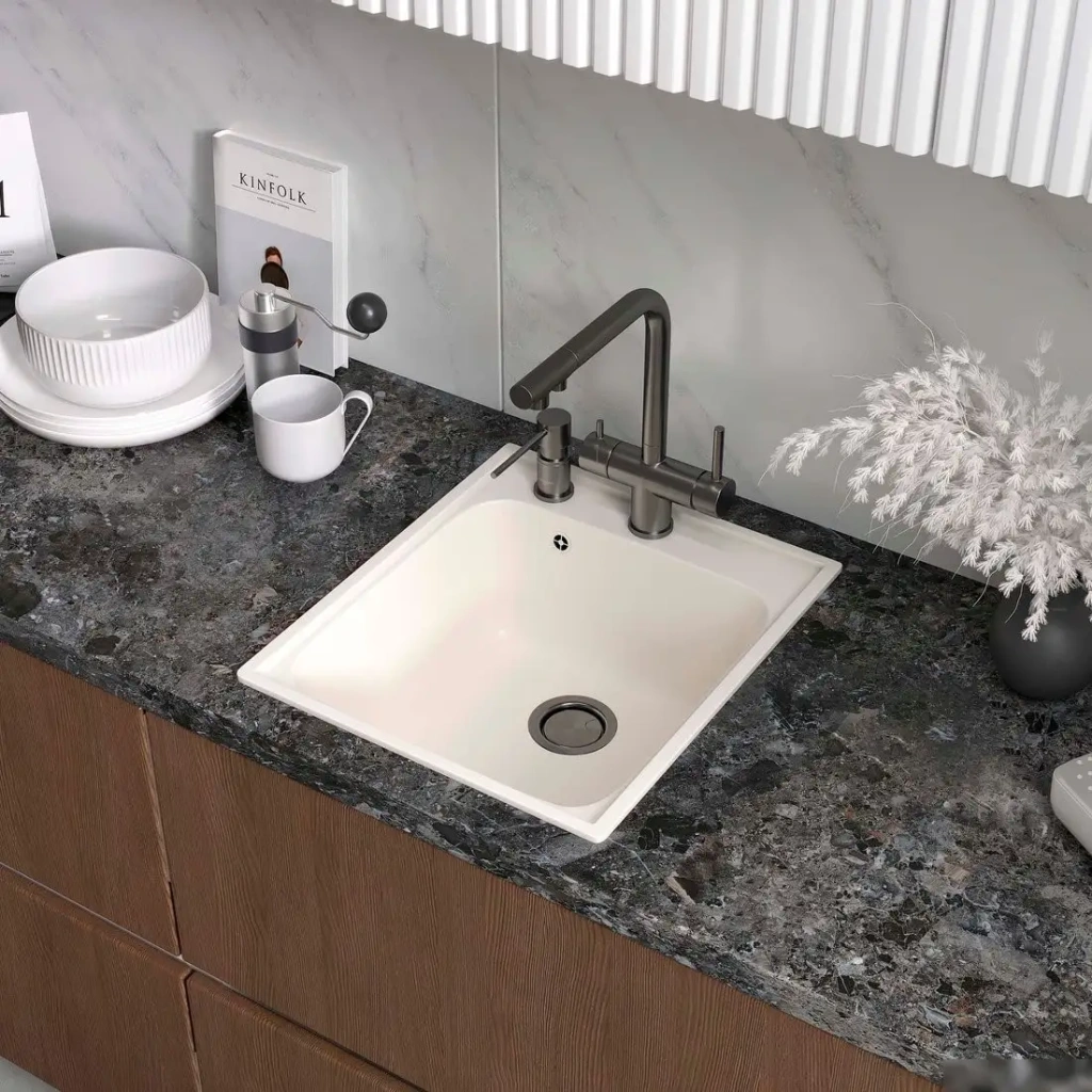 Кухонная мойка Reflexion Quadra RF0243WH выполнена из искусственного камня на основе кварцевого песка, что обеспечивает прочность и долговечность. Она имеет прямоугольную форму с одной чашей, расположенной по центру, и глубиной 18 см, что удобно для мытья посуды и продуктов. Установка осуществляется врезкой на столешницу, что создает аккуратный и современный вид. Размеры мойки подходят для шкафов шириной 45 см, а ее габариты — около 48 x 42 см. Мойка поставляется без смесителя, диспенсера и других дополнительных элементов, что дает возможность выбрать оборудование по своему вкусу. Основная чаша оснащена переливом для предотвращения переливания воды. Благодаря лаконичному дизайну и нейтральному белому цвету, мойка легко впишется в любой интерьер кухни. Надежная упаковка и гарантийный талон обеспечивают спокойствие при покупке.