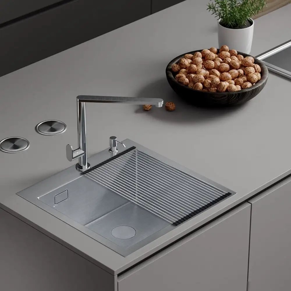 Кухонная мойка Roxen Simple 560220-45 из Финляндии хорошо подойдет для любой кухни. Она устанавливается врезным способом прямо на столешницу и имеет прямоугольную форму с одной чашей глубиной 22 см. Мойка изготовлена из прочной нержавеющей стали толщиной 3 мм с матовой поверхностью, что делает её долговечной и удобной в уходе. В комплект входят корзина, дискпенсер для моющих средств, а также все необходимые крепления и заглушки. Размеры мойки 45 на 45 см создают достаточно места для мытья посуды. Одним из её преимуществ является наличие автоматического клапана для сливного отверстия и разделочной доски.