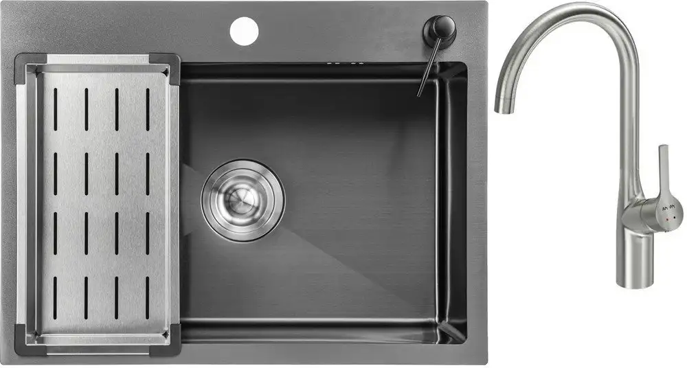 Кухонная мойка Saniteco 6045 Nano сочетается с любым интерьером благодаря своему строгому черному цвету и сатиновой поверхности. Она имеет одну просторную чашу из нержавеющей стали, которая легко моется и долго служит. Мойка устанавливается врезным способом под столешницу, что делает ее удобно интегрированной в кухонную поверхность. В комплект входит смеситель, коландер и дозатор для моющих средств, что делает работу на кухне проще и быстрее. Отсутствие перелива и крыла не мешают использовать мою удобно и безопасно. Благодаря качественной комплектации и надежным материалам, эта мойка прослужит долго и не потеряет внешний вид. Главные преимущества — удобная оргтехника и простота использования.