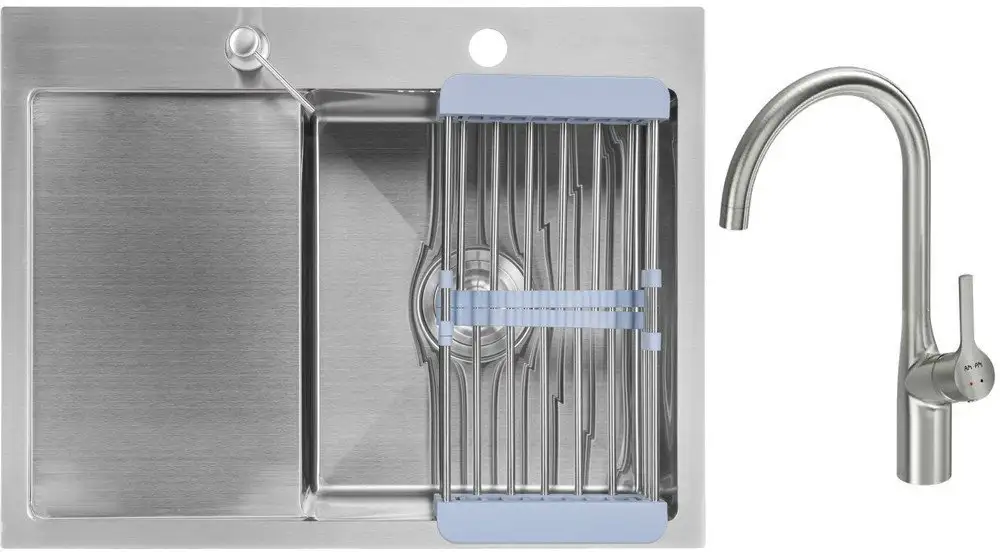 Эта кухонная мойка Saniteco 6550-R выполнена из прочной нержавеющей стали толщиной 3 мм и имеет современный сатиновый цвет. Она устанавливается прямо на столешницу и подходит для врезки, благодаря чему выглядит аккуратно и удобно. В комплект входит один глубокий квадратный отсек глубиной 21 см, что позволяет легко мыть крупные предметы и продукты. В мойке есть дополнительный крыло для удобно размещения посуды, а также слив с переливом, чтобы избежать переполнения. Комплектация включает смеситель AM.PM Spike F9S07011 в стиле сатин, коландер для посуды и дозатор для моющих средств — всё необходимые элементы для комфортной работы. Общие размеры составляют 65 см длиной и 50 см шириной, что позволяет установить ее в стандартную кухонную поверхность. Эта мойка — простое и удобное решение для современной кухни.