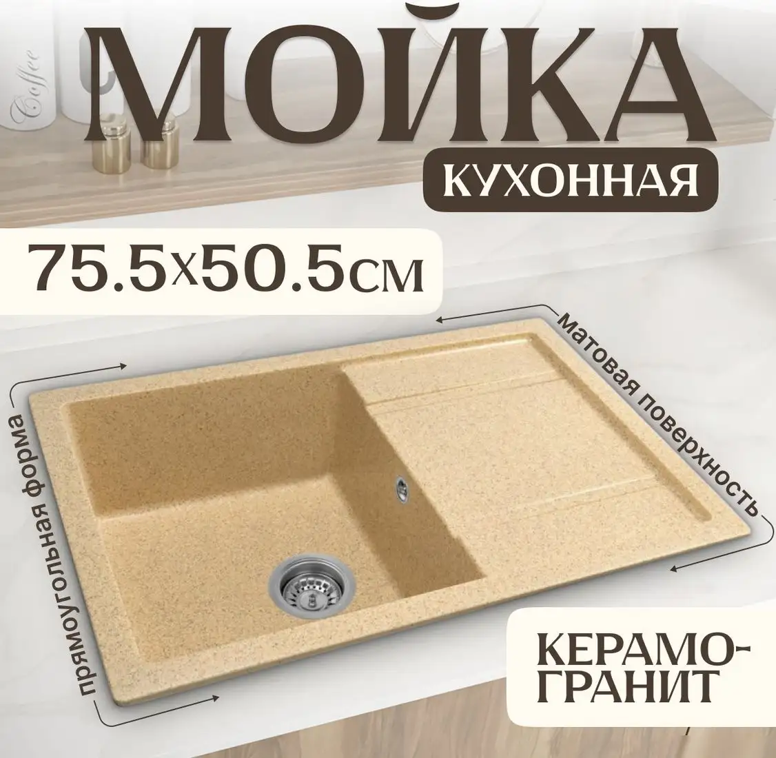 Кухонная мойка Saniteco Fama выполнена из искусственного камня на основе гранитной крошки и имеет матовую поверхность бежевого цвета. Она устанавливается прямо на столешницу и подходит для врезки, что делает её легко интегрируемой в любую кухню. Мойка имеет одну глубокую чашу глубиной 20 см, которая хорошо подходит для мытья посуды и продуктов. В основной чаше есть слив с диаметром 3.5 дюйма и перелив, что обеспечивает дополнительную безопасность во время эксплуатации. Размеры мойки — 75.5 см в длину и 50.5 см в ширину, а площадь для установки составляет 49 см по ширине и 74 см по глубине. Комплектация включает саму мойку, но смеситель не входит. Это простая и надёжная модель для тех, кто ищет практичное решение для кухни.