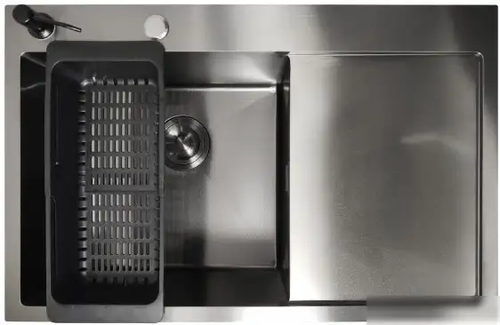 Кухонная мойка Stellar Decor S6550NB-L-D имеет современный нано черный цвет и выполнена из прочной нержавеющей стали толщиной 2,5 мм. Мойка устанавливается врезным способом прямо в столешницу и находится на уровне поверхности, что делает ее удобной и аккуратной. В ней есть одна большая чаша глубиной 22 см, которая подходит для мытья посуды и продуктов. В комплекте есть все необходимые крепления, сливная арматура и шаблон для установки, что облегчает монтаж. Основные размеры: длина 65 см, ширина 50 см, а сама чаша — 35 на 40 см. Эта модель лишена дополнительных звукоизоляционных покрытий, но обладает современной текстурированной поверхностью. Она отлично впишется в современную кухню и прослужит долго благодаря надежным материалам и удобной конструкции.