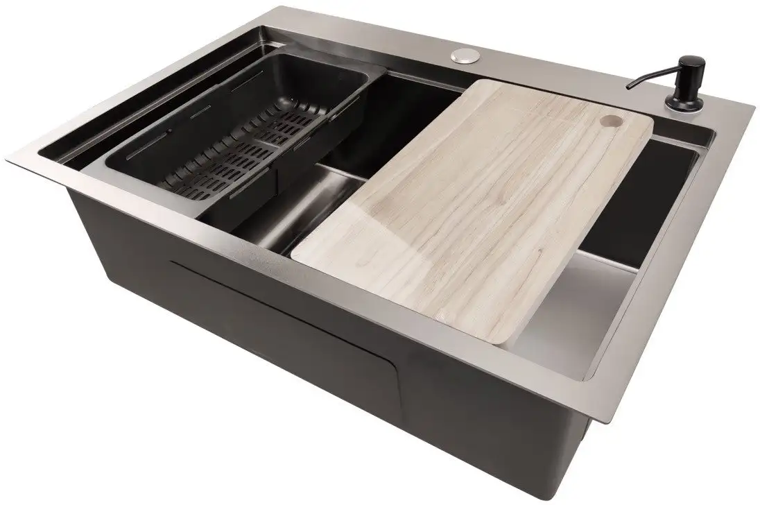 Кухонная мойка Stellar S6050NB-A выполнена из нержавеющей стали толщиной 2 мм, что обеспечивает её прочность и долговечность. Она имеет одну прямоугольную чашу с глубиной 22 см, расположенную по центру, что удобно для мытья посуды и продуктов. Мойка устанавливается различными способами: врезая в столешницу или под неё, а также вровень со столешницей. В комплект входит разделочная доска, а также все необходимые крепления и элементы для монтажа. Благодаря полированной поверхности мойка легко чистится и выглядит современно. Внутри есть перелив для предотвращения перелива воды.