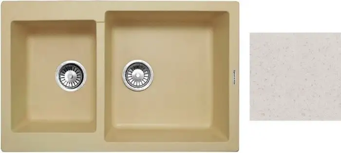 Кухонная мойка Zigmund & Shtain Rechteck 400.275 выполнена из искусственного камня, что делает её прочной и долговечной. Она устанавливается врезным способом на столешницу и подходит для шкафов шириной 60 см. Мойка имеет одну большую и одну малую чашу, глубиной 21 и 18 см соответственно, что удобно для различных задач. Основная чаша расположена так, что её можно обернуть в любую сторону, а диаметр сливного отверстия составляет 3,5 дюйма. Общие размеры мойки — 77,5 см по ширине и 49 см по глубине. Благодаря гладкой поверхности её легко чистить и поддерживать в порядке. В комплекте отсутствует механическая и разделочная доска, а также другие дополнительные принадлежности. Модель имеет минималистичный серый цвет, который хорошо сочетается с разными стилями кухни.