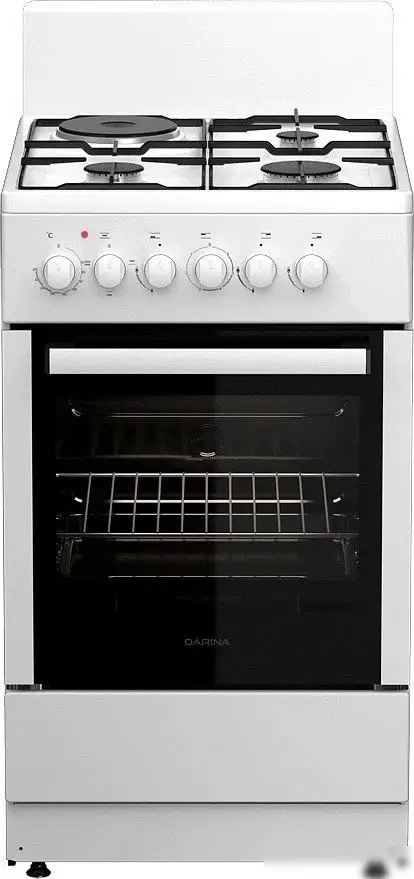 газ + электро панель + электрический духовой шкаф, поверхность: эмалированная сталь, щиток, управление механическое, без таймера, размеры (ШхГхВ): 50x60x85 см, цвет белый
