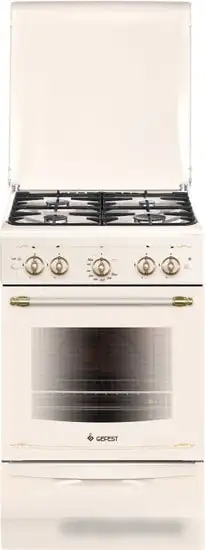 газовая панель + газовый духовой шкаф, поверхность: эмалированная сталь, крышка из эмалированной стали, управление механическое, без таймера, размеры (ШхГхВ): 50x58.5x85 см, цвет кремовый