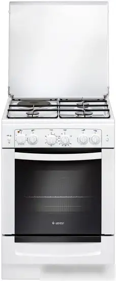 газ+электро панель + электрический духовой шкаф, поверхность: эмалированная сталь, крышка из эмалированной стали, управление механическое, таймер механический, размеры (ШхГхВ): 60x60x85 см, цвет белый