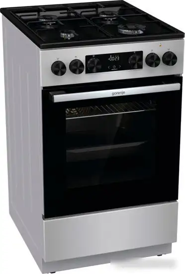Кухонная плита Gorenje GK5C60SJ сочетает газовую варочную панель с четырьмя конфорками и электрический духовой шкаф объемом 62 литра. Она выполнена из прочной эмалированной стали и управляется с помощью электронных кнопок и светодиодного экрана. В духовке есть 10 разных режимов работы, включая гриль и конвекцию, а также функция быстрого разогрева. Модель оснащена автоматическим электроспособом зажигания конфорок и системой паровой очистки духового шкафа, что облегчает уход за прибором.