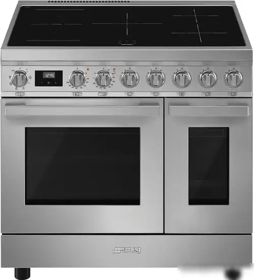 Кухонная плита Smeg CPF92IMX сочетает в себе индукционную варочную панель с пятью быстро нагревающимися конфорками и современный электрический духовой шкаф. Варочная поверхность выполнена из стеклокерамики, что облегчает очистку, а наличие индукционных конфорок обеспечивает быстрый нагрев и безопасность. В духовке есть 7 режимов работы, включая гриль и конвекцию, что позволяет готовить разнообразные блюда. Объем духовки составляет 105 литров, разделённых на две камеры для одновременного приготовления. Электронное управление и светодиодный дисплей делают использование удобным, а наличие таймера и индикатора остаточного тепла помогает контролировать процесс. Глазурованное стекло дверцы с тремя стеклами обеспечивает хорошую теплоизоляцию и безопасность. В комплект входят противни, решетки и ящики для посуды, что расширяет возможности приготовления. Плита весит 66,8 кг, что говорит о её надёжности и прочности. Эта модель подходит для тех, кто ценит современные технологии, надежность и удобство при приготовлении еды.