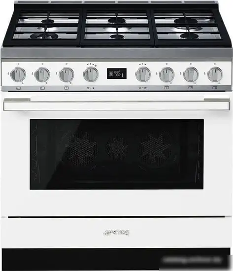 Кухонная плита Smeg CPF9GPWH сочетает газовую варочную панель с 6 конфорками, включая конфорку WOK для быстрого приготовления. На панели есть электроподжиг для удобства зажигания огня. В духовке установлен электрический нагреватель с объёмом 115 литров и 14 режимов работы, такими как гриль, конвекция и их комбинации, что помогает готовить разнообразные блюда. Духовой шкаф оснащён системой паровой очистки для более лёгкого ухода. В устройстве есть ЖК-экран и электронный таймер с звуковым сигналом, что облегчает контроль процесса готовки. Дверца духовки состоит из 4 стекол и плавно закрывается для безопасности и удобства. Например, плита имеет автоматический электроподжиг и газ-контроль, что делает использование безопасным. В комплект входят противни, решётки и вертел для разных способов приготовления. Материал рабочей поверхности — нержавеющая сталь, что обеспечивает долговечность и простоту очистки. Плита оснащена защитным щитком и работает на классе энергопотребления A+.