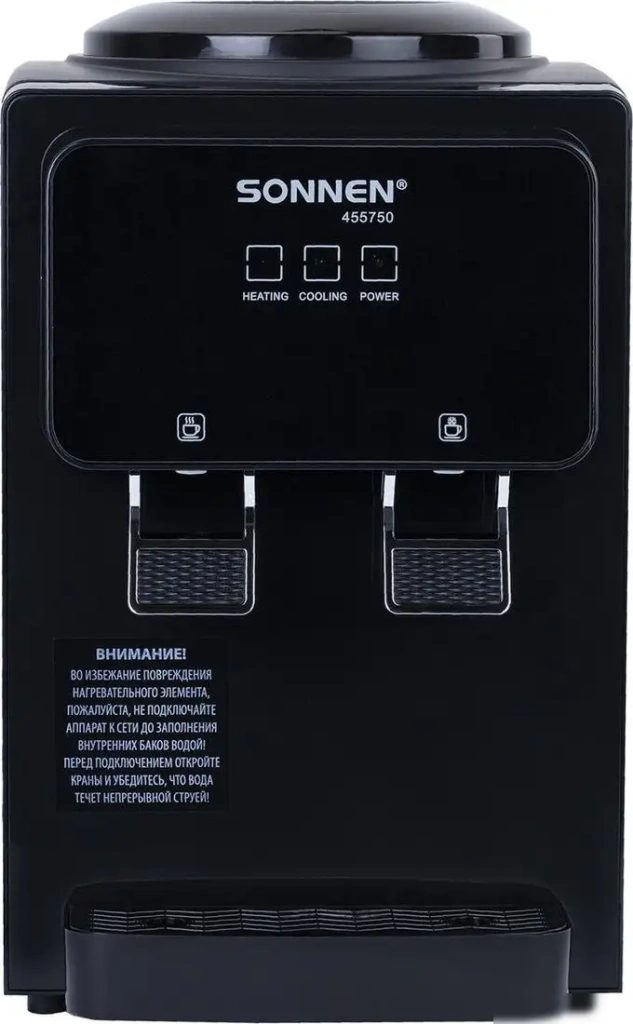 Кулер для воды Sonnen TSE-02FBP легко впишется в любой офис или дом. Он устанавливается на стол и работает по электросхеме, охлаждая воду до 15°C и нагревая её до 90°C. Устройство подает воду из бутылки сверху и оснащено удобным нажимным краном. В кулере есть встроенные баки: 0,4 л для холодной воды и 0,7 л для горячей, что позволяет быстро получать нужную температуру. Мощность охлаждения составляет 70 Вт, а нагрева — 500 Вт, благодаря чему он быстро подает горячую и холодную воду. Он занимает мало места — 400 мм в ширину, 290 мм в глубину и 250 мм в высоту, весит всего 3,5 кг. Корпус сделан из пластика и имеет черный цвет, он прочный и прост в уходе. Такой кулер не имеет дополнительных функций, но надежно обеспечивает питьевую воду. Он отлично подходит для ежедневного использования без лишних функций и сложных настроек.