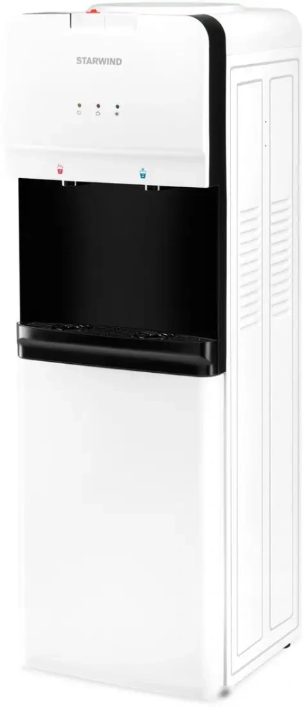Кулер для воды StarWind SW-1005EW — это напольное устройство с электронным охлаждением и нагревом. Он подает воду сверху в бутылке, что облегчает заправку. Корпус изготовлен из пластика и представлен в белом и черном цвете. Он умеет охлаждать воду до 10-15°C при мощности 75 Вт и нагревать до 85-95°C при мощносте 550 Вт. В кулер встроены бак холодной воды объемом 0,8 литра и бак горячей — 1 литр. Он имеет встроенный шкаф для хранения, что удобно для размещения стаканов или других предметов. Устройство защищено от детей, что повышает безопасность эксплуатации. Вес кулера составляет 5,6 кг, его легко перенести и установить. Благодаря простому управлению и функциям охлаждения и нагрева, кулер обеспечивает удобство и быстрый доступ к воде.