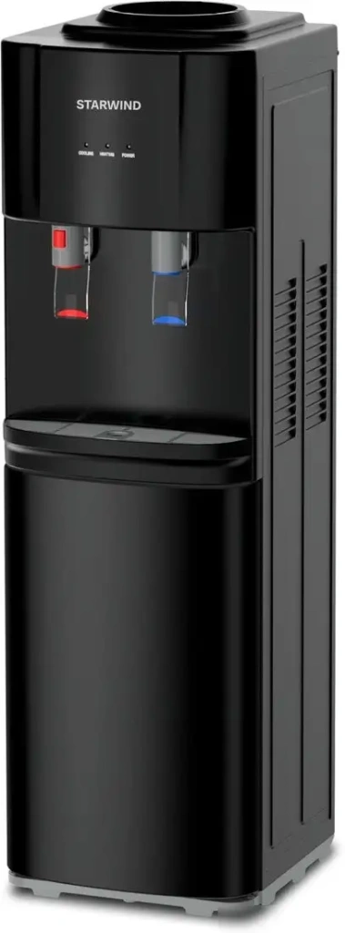 Кулер для воды StarWind SW-1113EB — это напольное устройство, которое охлаждает и нагревает воду для вашего удобства. Он подключается сверху к бутыли воды и выполнен из простого пластика в черном цвете. Кулер имеет встроенный электронный охлаждающий блок и внутренний нагревательный элемент, позволяющие получать холодную воду температуры 10–15°C и горячую до 95°C. Он обеспечивает подачу до 1.3 литров охлажденной воды и 5 литров нагретой в час, что удобно для домашних и офисных условий. В устройстве есть встроенный шкаф для хранения небольших предметов. Кран для подачи воды работает нажатием кружки, что упрощает использование. Размеры кулера — шириной 310 мм, высотой 1025 мм и глубиной 340 мм; весит он 7.6 кг. Защитная система блокировки обеспечивает безопасность для детей. Кулер не оснащен фильтром, льдогенератором или подсветкой, что делает его простым и надежным в использовании.