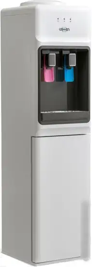 Кулер для воды Vatten V44WE — это напольное устройство, которое охлаждает и нагревает воду для вашего удобства. Оно работает от электросети и подает воду через кулю сверху. Устройство охлаждает воду до 15°C со скоростью 0.6 л/ч и нагревает до 85°C с мощностью 420 Вт. В нем есть встроенный шкаф на 14 л для хранения посуды или других мелочей. Вы можете нажимать на кран кружкой, чтобы наливать воду удобно и гигиенично. Общое потребление энергии в сутки составляет примерно 1 000 Вт·ч, что помогает экономить электроэнергию. Размеры кулера — 274 мм в ширину, 1086 мм в высоту и 312 мм в глубину, он занимает немного места в помещении. Устройство не имеет встроенного холодильника, льдогенератора или винного шкафа, что упрощает его использование и обслуживание. Благодаря простоте и функциональности, кулер подходит для дома или офиса.
