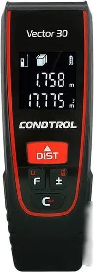 Лазерный дальномер Condtrol Vector 30 предназначен для измерения расстояний до 30 метров с точностью до 3 мм. Он использует красный лазер с классом безопасности 2 и мощностью 1 мВт, что делает его безопасным и удобным в использовании. Корпус устройства защищён по стандарту IP54, он устойчив к пыли и влаге, а небольшие размеры и лёгкий вес позволяют удобно носить его с собой. В дальномер встроена подсветка экрана для комфортного чтения данных в любых условиях. Устройство работает на двух батарейках AAA, и их ресурс позволяет выполнить более 5000 измерений. К функциям относятся автоматическое измерение, сложение и вычитание длины, вычисление площади и объема, а также расчет по теореме Пифагора. Также есть таймер для отсроченного измерения.