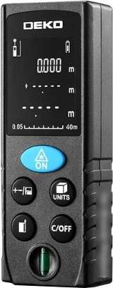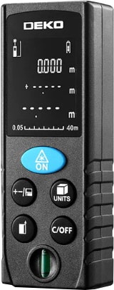 Лазерный дальномер Deko LRD110-40m позволяет измерять расстояния до 40 метров с точностью до 2 мм. Он работает с лазером красного цвета, мощностью 1 мВт, что обеспечивает безопасность при использовании. Корпус устройства защищен по стандарту IP54, что делает его устойчивым к пыли и брызгам. Для удобства есть подсветка экрана и возможность сохранения измерений в памяти. Дальномер прост в использовании — есть функции сложения, вычитания, расчет площади, объема и параметры Пифагора. Вес всего 90 г и автономное питание от батареек позволяют брать его с собой куда угодно.