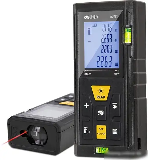 Лазерный дальномер Deli DL4168 — это устройство, которое помогает измерять расстояния до 40 метров с точностью до 3 мм. Он выполнен в черном цвете и удобно помещается в руку благодаря длине 170 мм и лёгкому весу. Встроенная подсветка экрана позволяет легко читать результаты, даже при плохом освещении. Лазер работает на красной волне 670 нм с мощностью 1 мВт, что обеспечивает безопасность и долгий срок службы. Для питания использует две щелочные батарейки ААА, что делает его простым в использовании и обслуживании. Технические характеристики позволяют использовать устройство в диапазоне температур от 0 до 40 °С, что делает его подходящим для различных условий. Отсутствие оптического визира и датчика наклона сделают работу максимально простой и понятной.
