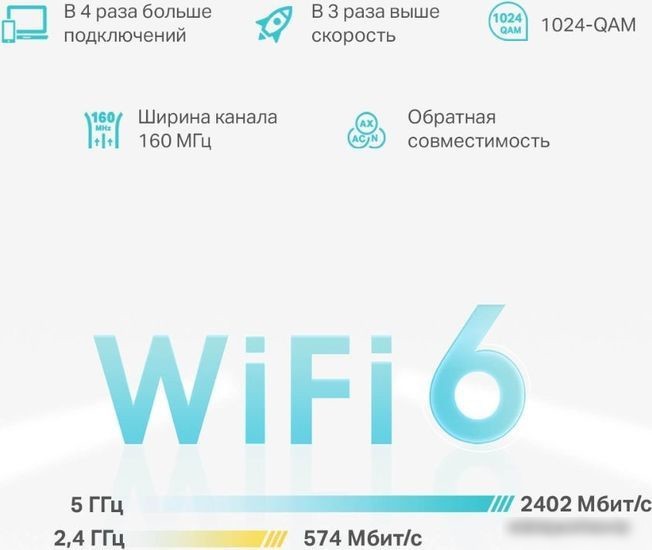 802.11ax (Wi-Fi 6), 2.4 ГГц/5 ГГц, до 2976 Mbps, 0xWAN, 3xGigabit LAN